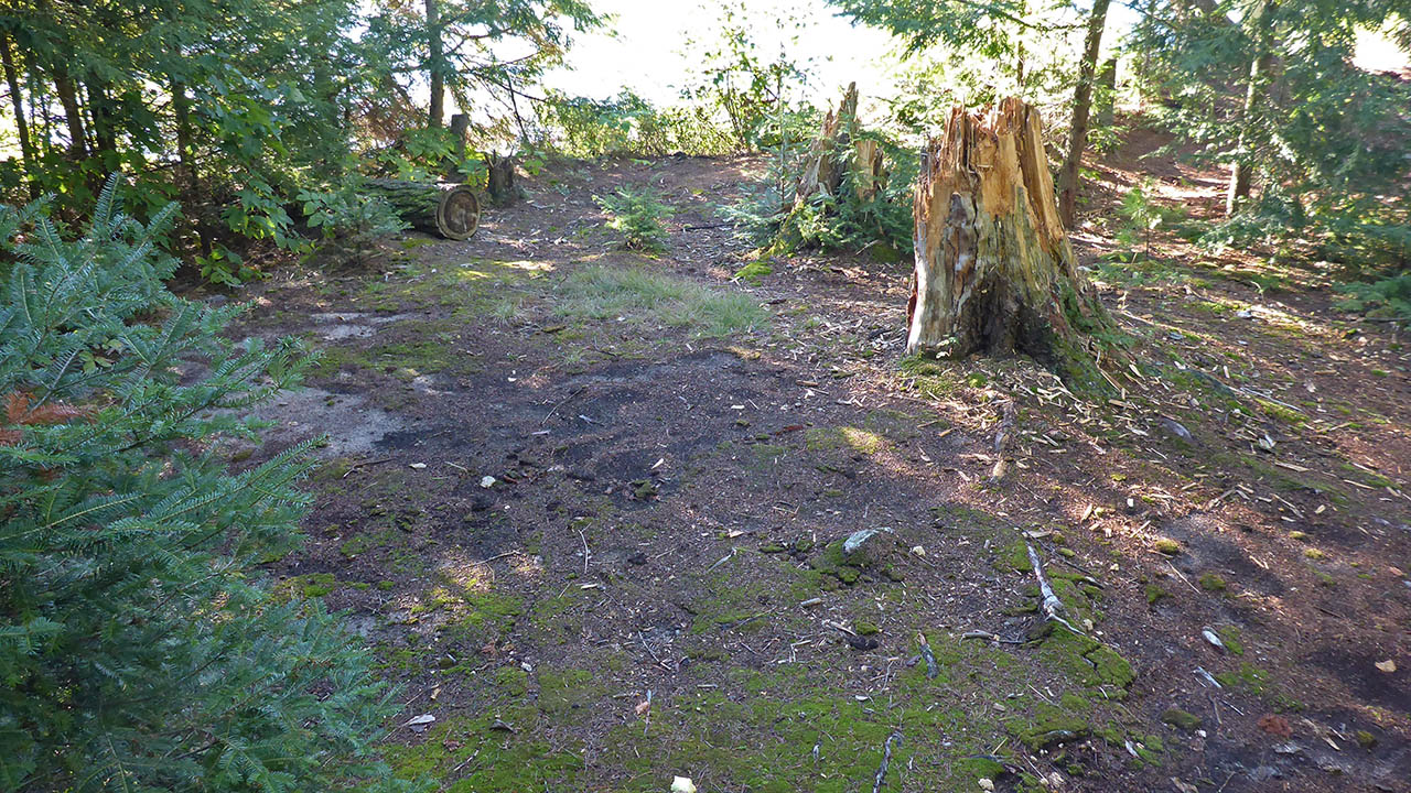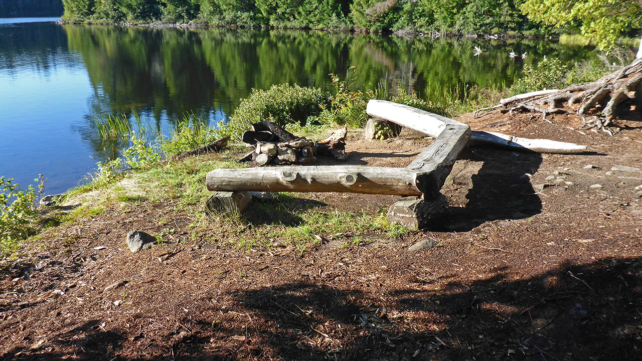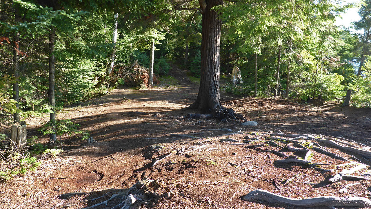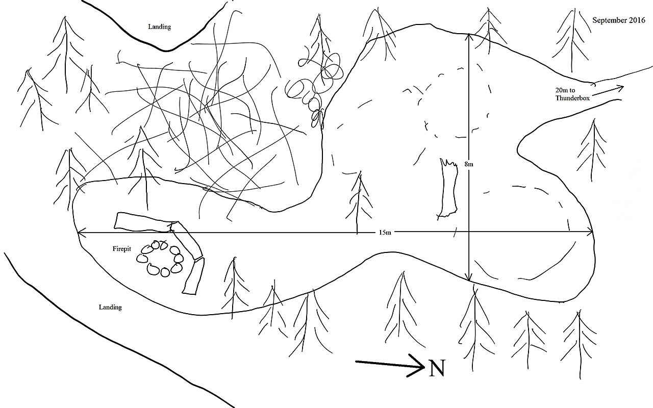 Campsite Campsite maintenance: Regular Open ground area: 15m x 8m. Extent of tree cover: 40% . Degree of levelness: Level at tentpads and firepit. Number of level tent sites: 3. North exposure: trees. East exposure: trees, open view of lake at firepit. South exposure: open view of lake. West exposure: trees, open view of lake at firepit. General description: A medium sized site with a great view of the lake from the firepit. The firepit area is completely open to the sky while the tenting area has enough trees to offer some protection from any wind. There are 2 landing areas, while the area to the west side would offer the easiest landing. Overall accessibility: No issues when landing on the west side of the island. When landing on the east side, there is a slight lift and carry over some uneven ground.