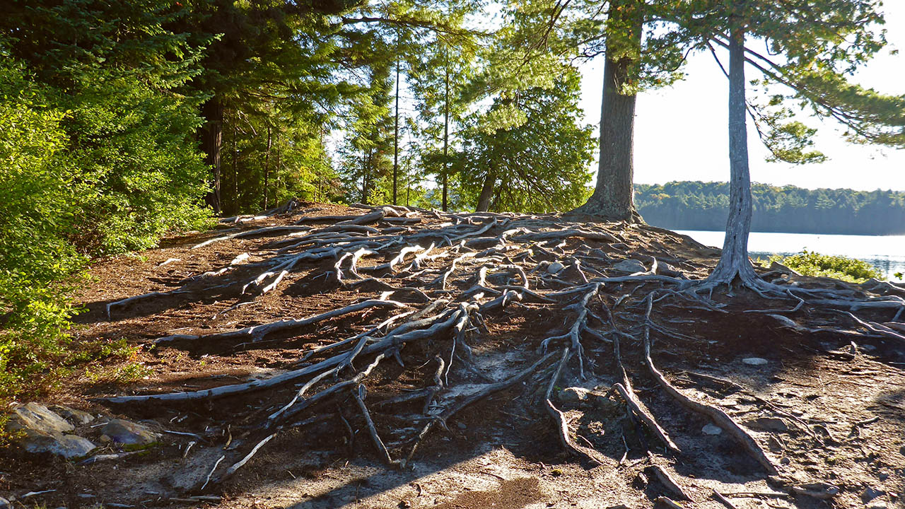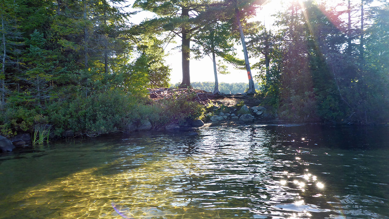 Landing Topography of under-water approach: : East landing - small rock & silt. West landing - sandy beach. Impediments to disembarking from and/or unloading a canoe: East landing - slight lift to site. West landing - None. Topography to tent sites: East landing - short level carry. West landing - carry up over rooty section.