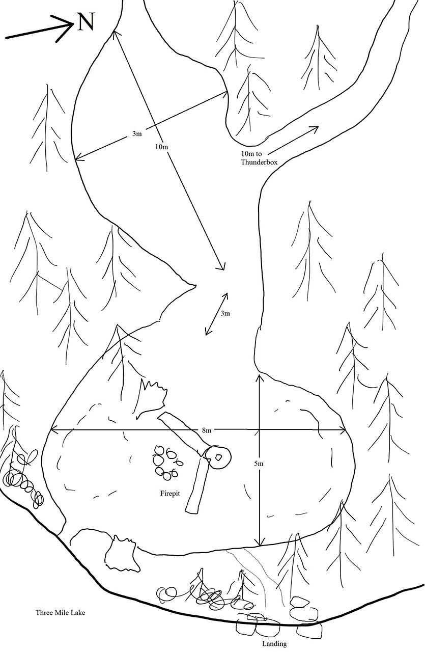 Campsite Location Single island site in southwest bay. Landing Topography of under-water approach: Rocky. Impediments to disembarking from and/or unloading a canoe: Had to tie canoe canoe to a tree. There was no real landing. Topography leading to tent sites: Very steep rock 2-3 m high.
