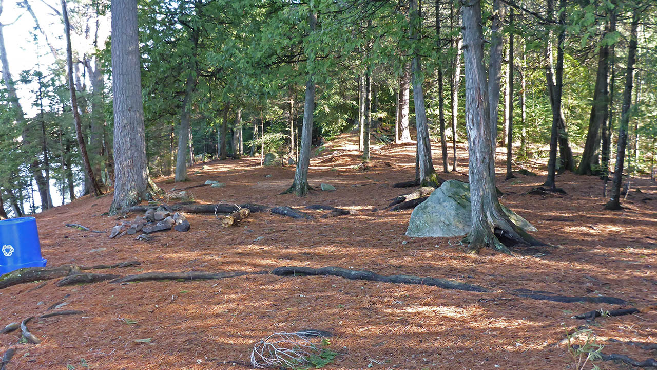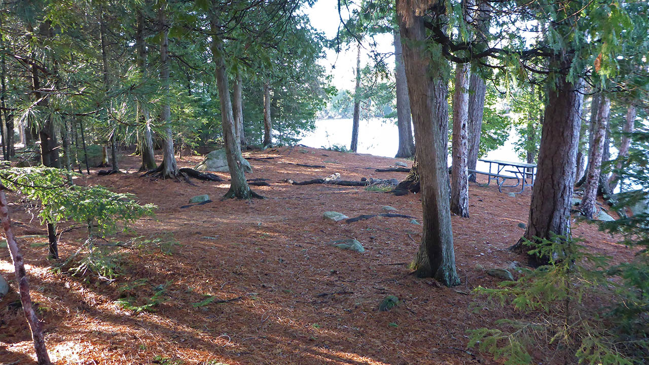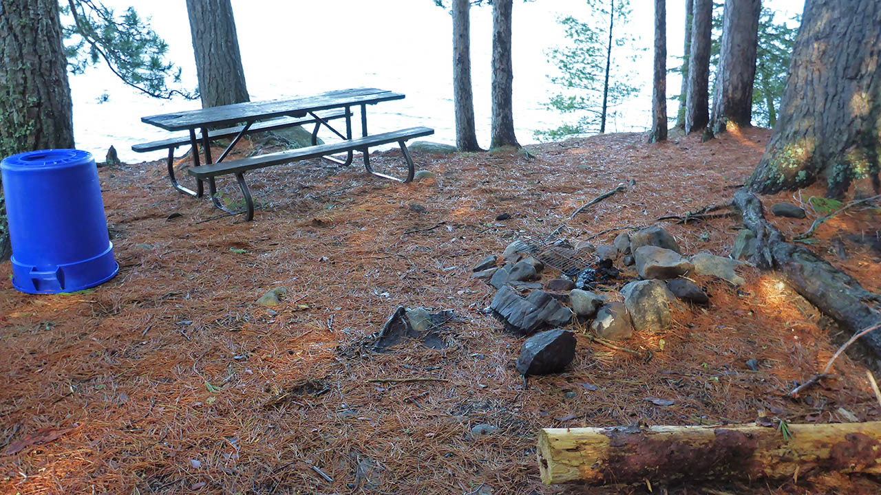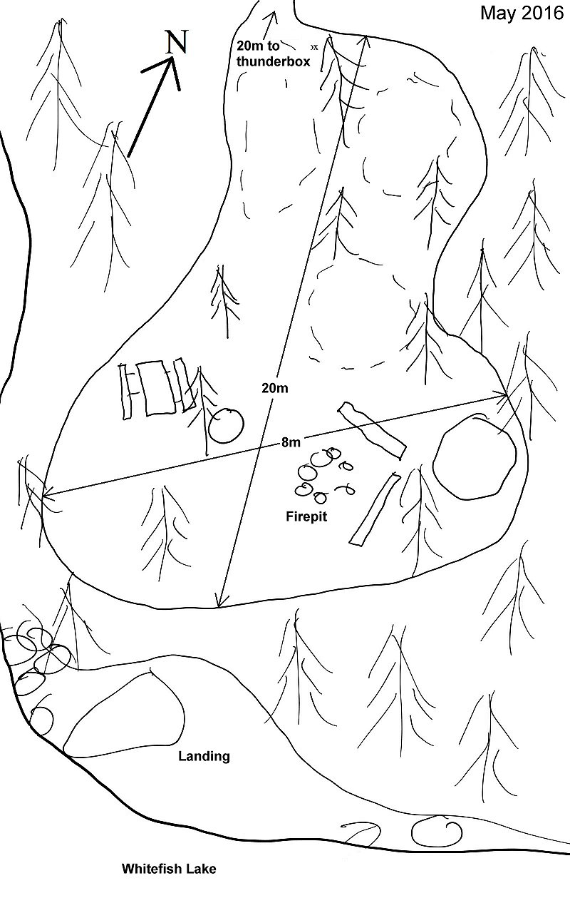 Important Update: The original campsite report that follows this update, reflects the situation in 2016. At that time, the campsite was still functional as such .. with a waterfront sign and thunderbox. At some time between 2016 and 2023, this campsite was de-activated. Also during that period, an area on the north end of the nearby island was changed from a "no-camping" designation to a functional campsite, thereby keeping the number of the lake's campsite at three. This change defers to the Whitney and Area Algonquins having their Whitfish Pow-wow Site immediately north of Campsite 2. Below this update is the campsite's original 2016 campsite report. It is being retained here under its revised number "2x" purely for reference purposes. Following is a recent sign giving explanation of the closing of campsite by Ontario Parks (photo by Cody Stein of the website Algonquin & Beyond) ... Location: N45° 32.936' W78° 25.231' Landing Topography of under-water approach: Large flat rock with a significant drop-off. Impediments to disembarking from and/or unloading a canoe: None. Topography to tent sites: A short smooth carry up a slight incline. Landing, an easy climb to the site ... Campsite Campsite maintenance: Regular. Size of open area: 20m x 8m. Extent of tree cover: 70%. Degree of levelness: Generally level with some rocks and roots. Number of level tent sites: 5+. North exposure: Trees. East exposure: Trees. South exposure: Lake. West exposure: Lake. General description: A large site that has numerous tenting options and even though it is somewhat rocky and rooty, it could hold more than 5 tents if needed. Level, but drops off at the shore all around the site. The picnic table is a nice touch when you're "roughin" it. Overall accessibility: A short climb from the landing area. The picnic table and the recycle can are a nice touch ... Looking from the landing north with rising sun lighting up the back of the site ... View from east side of site ... Looking south from back of site ... ![]() Thanks to Jeffrey McMurtrie of Jeff'sMap for supplying the base-layer map component by Creative Commons licensing. Submitted by Chris Taylor .. Visited May 2016 .. Submission September, 2016 |